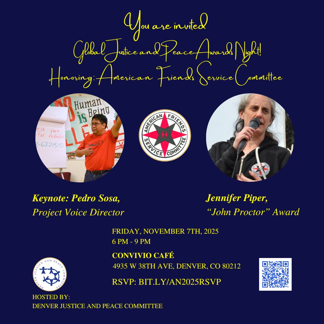 During the event DJPC will honor American Friends Service Committee with the Global Justice and Peace Award, and compañera Jennifer Piper with the “John Proctor” Organizer Award. Piper is the Program Co-Director for AFSC Denver.